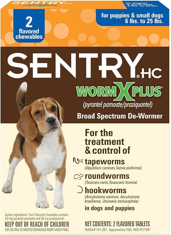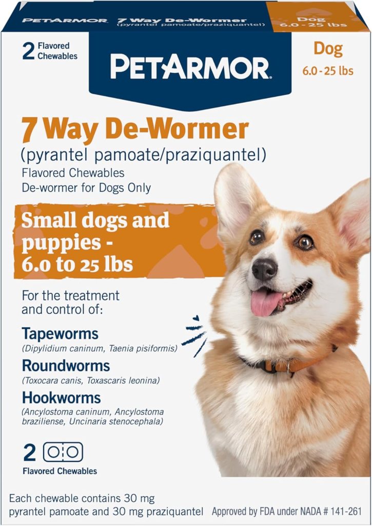 - Description: Chewable tablets with pyrantel pamoate and praziquantel, targeting tapeworms, roundworms, and hookworms. This product is ideal for small dogs and puppies weighing no more than 25 pounds.
