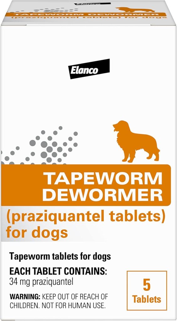 - Description: Praziquantel tablets targeting tapeworms, suitable for dogs 4+ weeks. Each pack contains five tablets.