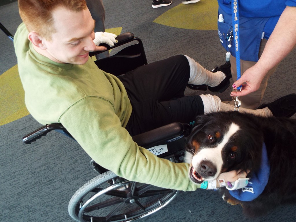 Bernese Mountain Dogs are well-known for their quiet, affectionate demeanor and those clearly soulful eyes. Often weighing more than 100 pounds, their outstanding strength helps with wheelchair support, bracing, and mobility chores, including balance.